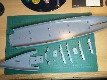 Die Yamato in 1:350 von Tamiya als Premium Version. Baubeginn mit dem Rumpf.