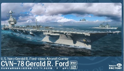 Bausatz der CVN-78 Gerald R. Ford 1:700der Firma Magic Factory. Zubehör sind Ätzteile für die Reling.